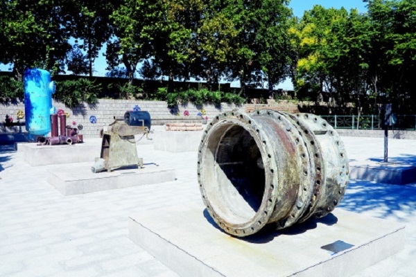 1906年前德国制造,带撤水直径200毫米四通排沙阀门及相连管道、闸阀,2012年5月取自新疆路和陵县支路路口。供水行业使用四通阀门极其罕见,带排沙功能的更为罕见。早期,由于工艺不完善,自来水中会混有沙子。该阀门底部比管道低,可以储存流水中的沙子,起沉砂池作用,隔一段时间启闭阀门可使储存的沙子淌出。